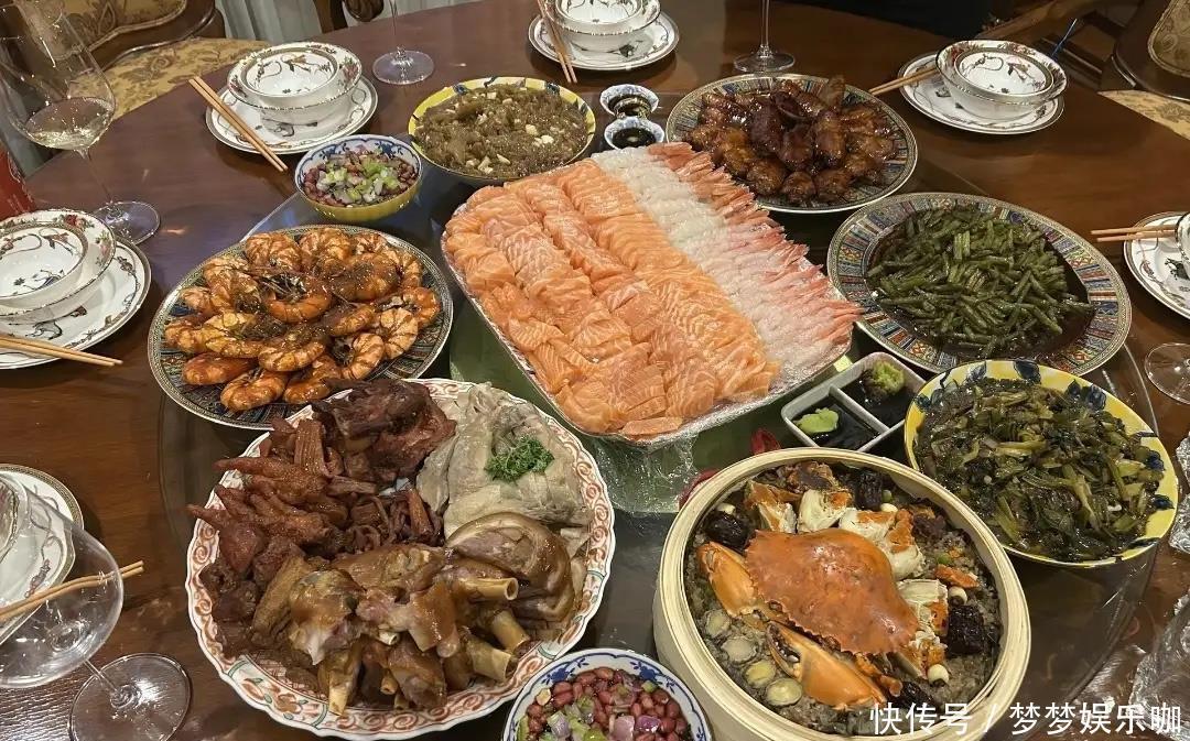 他们聚在一起吃饭,菜挺丰富的,有三文鱼、虾刺身拼盘,再加上一整只大螃蟹,还有佛跳墙、滚烫的海鲜锅什么的,真是摆了不少好菜。四个孩子从小就一块长大,每年都要聚在一块吃饭,还会拍合照留念。这样的情谊,真的挺令人羡慕的。