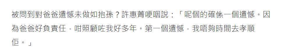 问到爸爸何时开始情况转差,许惠菁再提到这段时期感到很不真实,很多都感到模糊。她指大家觉得震惊,其实她和家人、朋友亦难接受。问到有否遗憾未跟爸爸讲或做的事,例如爸爸未抱孙,许惠菁不禁双眼通红,哽咽指这个的确很遗憾,指爸爸负责任、很有爱,照顾她多年,她一度讲不下去,坦言好遗憾不够时间让她孝顺爸爸,强忍泪水指爸爸一直很支持她想做的事,并未预先为孙改名,一切看她自己。她为有这个爸爸感骄傲,爸爸努力工作,对人真诚关怀。
