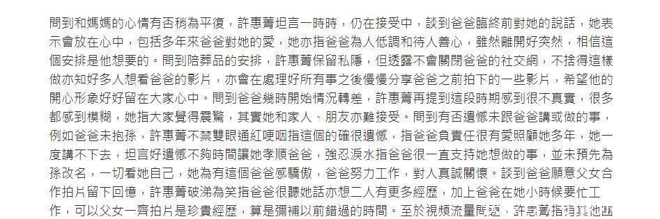 问到和妈妈的心情有否稍微平复,许惠菁坦言一时时,仍在接受中。谈到爸爸临终前对她的说话,她表示会放在心中,包括多年来爸爸对她的爱。她亦指爸爸为人低调和待人善心,虽然离开得很突然,相信这个安排是他想要的。问到陪葬品的安排,许惠菁保留隐私,但透露不会关闭爸爸的社交网,舍不得这样做,亦知好多人想看爸爸的影片,亦会在处理好所有事之后慢慢分享爸爸之前拍下的一些影片,希望他的开心形象好好留在大家心中。